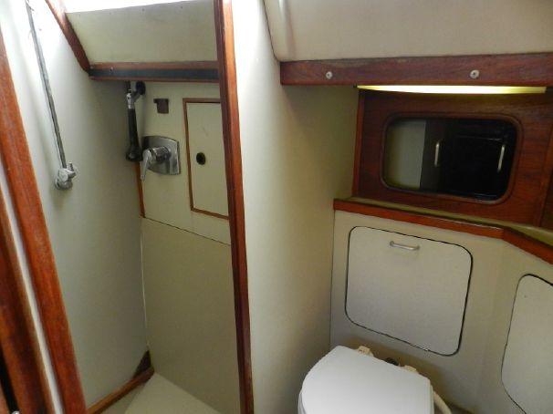 Directly across from the galley to starboard is a large head with either a separate shower stall or a large linens closet. Most C&C Landfall 38s appear to have had the separate shower stall. There is storage behind the toilet, below the sink, and above both, all with either hatch or sliding doors. Having the galley and the head amidships is ideal for comfortable usage. Having so much space dedicated to the galley and the head maybe ideal for liveaboards.